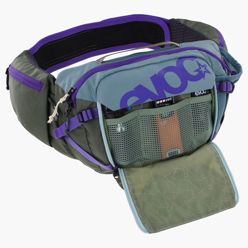 Ledvinka Evoc Hip Pack Pro 3 l, která pojme veškeré nezbytné nářadí, občerstvení ve formě tyčinek a gelů, přičemž vám stále poskytne plný rozsah pohybu při jízdě na kole.
